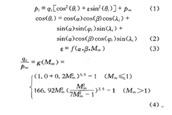 FADS系統的空氣動力學模型把位流模型與修正的牛頓流模型(前者主要適用于亞音速條件,后者主要適用于超音速條件)與一個修正系數ε相結合,形成了不同馬赫情況下的帶補償的空氣動力學模型。ε的數值是在綜合考慮了壓縮效應、氣動外形、系統影響等因素而選取的。在飛行中,可以將其看成攻角、側滑角和馬赫數的函數,其函數關系可以在飛行前確定。