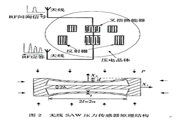 • 無線SAW壓力傳感器的原理。