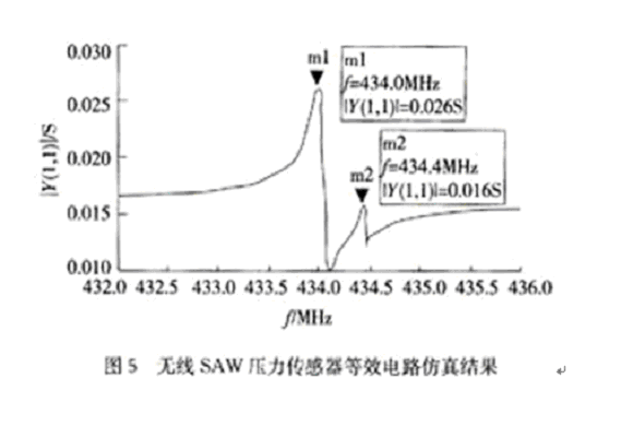 • SAW單端諧振器的等效電路對SAW壓力傳感器的仿真結果。
