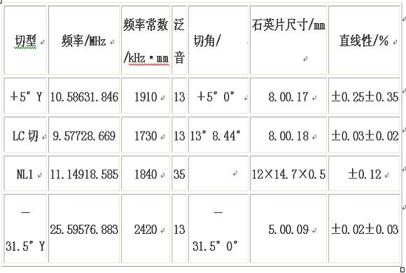 石英晶體的頻率溫度特性方程為:f=fO(1+aΔT+bΔT2+cΔT3),由此可見,通過切角的選擇,使系數b和c接近于零,可提高頻率溫度的線性度。石英晶體溫度計就是利用石英晶體的頻率溫度特性原理制成的。最先采用的為+5°Y切型,后來美國發明了溫度特性極好的LC切型,日本發明了NL切型,東洋通信研制的-31.5°Y切型的詳情見表1。