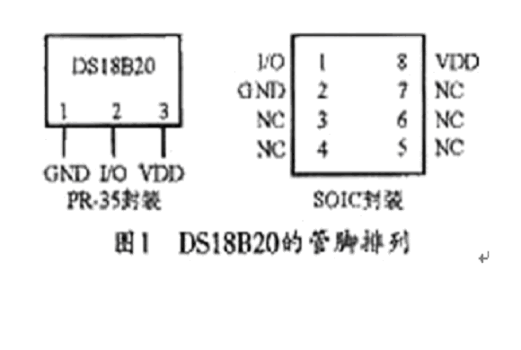 DS18B20采用3腳PR-35封裝或8腳SOIC封裝,其管腳排列如圖1所示。圖中,GND為地;I/O為數據輸入/輸出端(即單線總線),該腳為漏極開路輸出,常態下呈高電平;VDD是外部+5 V電源端,不用時應接地。