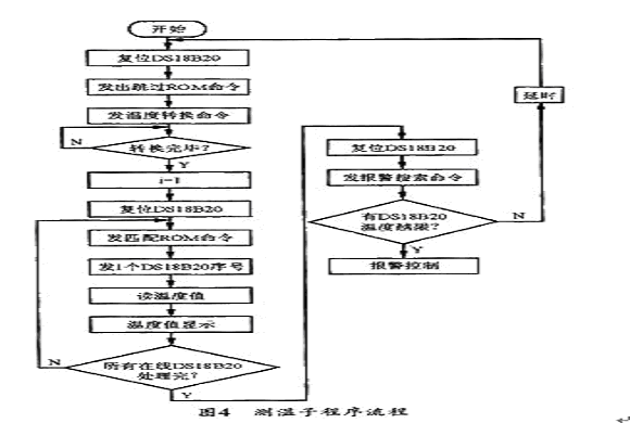 本系統程序主要包括主程序、讀出溫度子程序、溫度轉換命令子程序、計算溫度子程序、顯示數據刷新子程序等。編程時必須嚴格按照DS18B20的時序規定進行。尤其需要注意的是,在多點溫度測量中,由于多個DS18B20掛在一條總線上,為識別不同的器件,在系統安裝之前,應將主機逐個與DS18B20掛接,以讀出其序列號。具體是由主機先給DS18B20發一個復位脈沖,在DS18B20發回響應脈沖給主機后,主機再發讀ROM命令(代碼33H),并發一個15μs左右的脈沖,接著再讀取DS18B20序列號的一位,并用同樣方法讀取序列號的每一位。其V-T曲線控制系統主程序和測溫子程序分別如圖3和圖4所示。