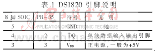 DS1820的PR-35封裝形式見圖1,其外表看起來像三極管。另外還有8腳SOIC封裝形式,只用3、4和5腳,其余為空腳或不需連接引腳。不過最常見的形式是PR-35封裝,其引腳說明如表1所示。