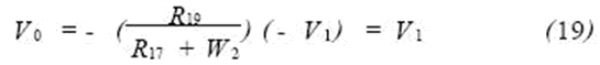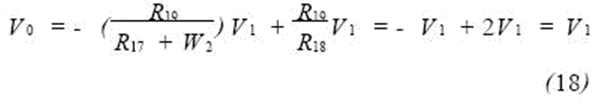 當輸入電壓Vi 為負半周期時,經A4反相,D2導通,D3截至,A4輸出為零,經R17,W2送來的A5的輸入信號為V1,另一路經A5輸入信號為V1,則輸出信號V0為: