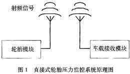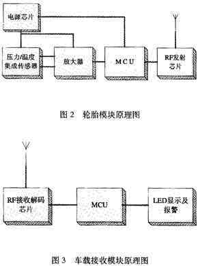 該系統(tǒng)的工作原理如下,把輪胎模塊裝置在輪胎內(nèi),壓力和溫度傳感器檢測(cè)輪胎內(nèi)部當(dāng)前的應(yīng)力和溫度信息,獲得的模擬信號(hào)經(jīng)過A/D變換器轉(zhuǎn)換成數(shù)字信號(hào),然后通過射頻發(fā)射器發(fā)送出去。車載接收模塊裝置在駕駛室內(nèi),射頻接收器接收來自輪胎模塊的應(yīng)力和溫度信息,當(dāng)輪胎壓力過高或者過低時(shí),通過顯示和報(bào)警裝置發(fā)出報(bào)警信息。