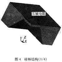 其中,壓阻式壓力傳感器主要是利用半導(dǎo)體的壓阻效應(yīng),把一個(gè)惠斯通電橋做在一個(gè)硅杯上,如圖4所示。當(dāng)硅杯受到壓力后發(fā)生形變,惠斯通電橋的四個(gè)橋臂電阻就會(huì)發(fā)生變化,打破了電平衡,從而會(huì)有一個(gè)電信號(hào)的輸出。