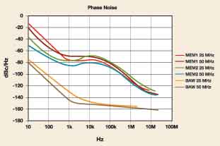 相位噪聲圖很好地展示了這些采用了不同技術的器件的設計與特性。鄰近區相位噪聲水平(<1kHz)主要取決于Q值或諧振器的選擇,石英BAW諧振器的選擇性遠高于其他MEMS器件。