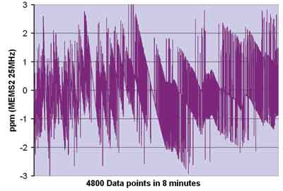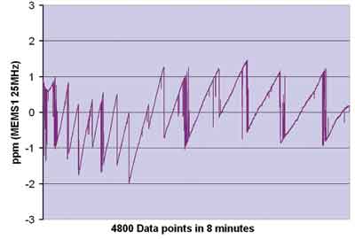如圖2所示,此處給出的短期穩定度數據是在8分鐘內每隔0.1s測量穩定在25℃(誤差僅零點幾度)的振蕩器的頻率值。各部分均由安捷倫53152頻率計數器測試,該計數器利用銣原子頻率標準參考源進行工作。頻率變化以第一次讀數的百萬分率為單位顯示在圖中。