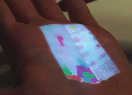 Skinput還將顯示器功能單獨分割出來。具體實現方法是,利用小型投影儀,將手掌及手臂作為顯示器使用(右上方的圖片)。