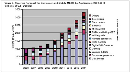 iSuppli公司資料顯示,各種新型器件在2010和2011年進入市場,也有助于刺激消費與移動MEMS市場的擴張。這些器件包括三軸陀螺儀、微型投影儀、RF MEMS開關(guān)和變?nèi)荻O體。總體來看,新型MEMS器件到2014年將額外帶來13億美元的銷售額,而2009年只有3300萬美元。