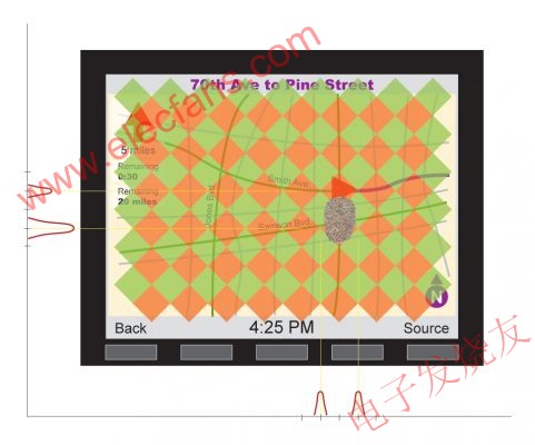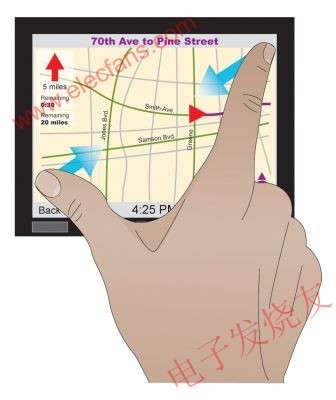 通過比較當前基于電阻式觸摸屏和帶手勢識別的電容式觸摸屏的汽車HMI概念,我們可以發現,新增手勢識別功能后,駕駛人員對路面的關注程度在某些方面有所改善。通過電容式觸摸屏的手勢識別不僅是一種新的輸入方式,更使系統輸入提升到了一個新的層次。采用電容式觸摸屏,駕駛人員仍然可以通過點擊瀏覽菜單結構,滑動手指提高音量或者調節HVAC風扇速度。不過,真正重要的是其控制標準功能的簡易度,比如控制駕駛過程中非常必要的導航功能。用戶不必緊盯著屏幕,只需一個簡單的手勢即可實現縮小操作。屏幕上的任何區域都可以感知手勢,因此駕駛人員不必把手指放在特定的位置來完成操作。圖1顯示就是這種導航屏幕上的動作感知說明。