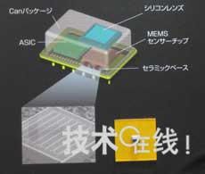 Grid-EYE將熱電偶用作傳感器元件。人感傳感器等廣泛使用的焦電型紅外線傳感器是信號沒有變化就無法檢測的微分型,而熱電偶方式即使信號沒有變化也可測量對象物體的絕對溫度。傳感器由采用MEMS技術的傳感器元件、進行數據補償等的ASIC以及硅透鏡等構成。傳感器元件以MEMS技術進行深蝕刻,形成了熱電偶。