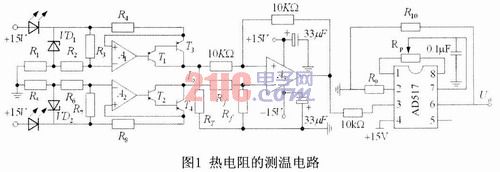 熱電阻的測溫電路如圖1所示,該電路由毫安級恒流源產生電路、差分運算電路和AD517芯片組成。該電路采用兩個完全相同的毫安級恒流源分別給熱電阻RT和標準參考電阻Rf供電。在恒流源電路中,VD1和VD2為帶溫度補償的穩壓二極管,四個PNP型的三極管T1、T2、T3和T4組成了兩個PNP型復合管,其目的是為了提高放大器的增益,減小誤差,以便提高恒流源的穩定度。恒流源與RT和Rf(Rf取為Rf=100Ω)與地組成的電路產生的電壓作為差分運算電路的輸入信號,根據電路的組成,可以得到差分運算電路的輸出電壓是與熱電阻的阻值成正比的,通過選擇合適的元器件參數把該裝置的測溫范圍設置為0~120℃。
