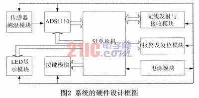 此基于EL-700鉑熱電阻傳感器的高精度測溫裝置既可以單機工作,又可以通過無線收發模塊實現與計算機之間的無線數據傳輸,把采集到的溫度信號送到計算機中進行分析、處理及打印,從而實現數據的遠距離傳輸與處理。測溫裝置主要由溫度信號的檢測與采集電路、LED顯示、按鍵控制、電源、報警及復位、無線發射與接收等功能模塊組成,每一個電路模塊完成一定的功能,測溫裝置的硬件總體組成框圖如圖2所示。