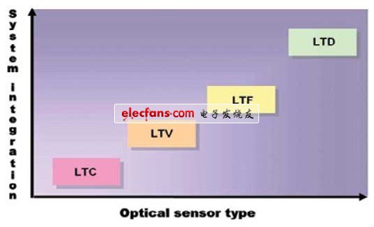 LTF的動(dòng)態(tài)范圍遠(yuǎn)遠(yuǎn)超過(guò)LTV器件,它適用于需要更高分辨率的應(yīng)用場(chǎng)合。例如,動(dòng)態(tài)范圍是4V而噪聲(暗電壓)是4mV的線性LTV器件可以提供1000個(gè)階梯,而動(dòng)態(tài)范圍是1MHz,噪聲(暗頻率)是0.5Hz的LTF可以提供200萬(wàn)個(gè)階梯,TAOSTSL237即為一例。LTF的頻率輸出需要使用一個(gè)頻率計(jì)數(shù)器或者微處理器進(jìn)行處理。LTD器件將光強(qiáng)轉(zhuǎn)換成數(shù)字?jǐn)?shù)據(jù)。然后,數(shù)字?jǐn)?shù)據(jù)被存儲(chǔ)在內(nèi)部寄存器之中,在那里,數(shù)據(jù)將隨著落在傳感器上的光強(qiáng)變化而成正比變化。LTD器件與微處理器之間通常使用各種不同協(xié)議之中的某一種作為接口,其中包括SMbus、I2C和SPI。這種器件的動(dòng)態(tài)范圍是寄存器最大和最小取值之差。其數(shù)字接口也使得這些器件有一定的可編程性,可用來(lái)控制增益以及積分時(shí)間等量。大多數(shù)LTD器件是可尋址的,這意味著多個(gè)器件可以在單根總線上共存,從而將互連成本降到最低。TAOSTSL2563是帶有可編程增益和積分時(shí)間的LTD器件的一個(gè)例子。這個(gè)傳感器通過(guò)I2C接口為編程狀態(tài)提供了中斷功能。
