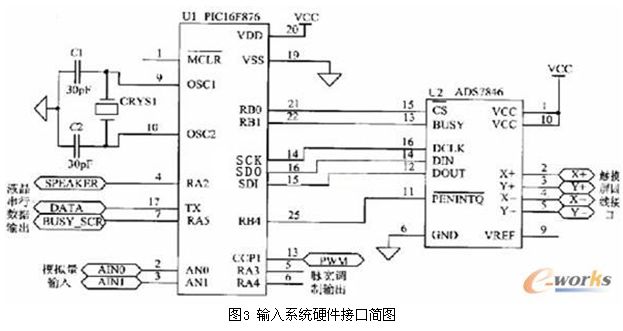 根據ADS7846與微控制器進行數據交換的接口特征,選用PIC16F876的SPI口。SPI口包括三個信號:SDO(串行數據輸出),SDI(串行數據輸入),SCK(串行同步時鐘)。硬件連接關系見圖3。