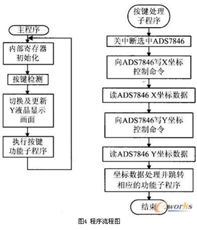 按照以上設計思想設計了應用軟件,圖4為主程序與觸摸屏輸入檢測部分的程序流程圖。其中,坐標數據處理通常采用查表的方法,將用戶命令的坐標形成數據表,利用獲得的坐標信息進行變換快速查表,從而提高軟件的運行速度。