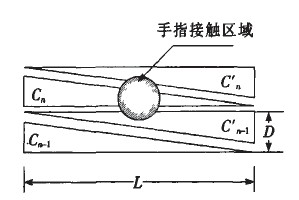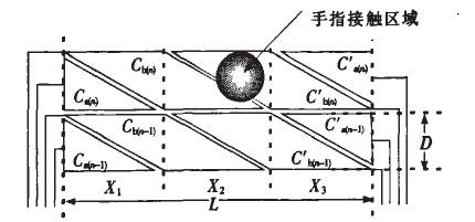 Ca(n)、Cb(n)為第一組感應電極,Cb(n)Cb(n)''''為第二組感應電極,Ca(n)''''Cb(n)''''為第三組感應電極,分別感應X1、X2、X3范圍內坐標點的位置。具體坐標計算方法與上述類似。設計中需要注意X1、X2、X3每組電極的寬度應與手指接觸面積的寬度相當,如寬度不足則需要增加菱形電極,否則手指接觸在相同區域內無法識別兩個感應點。