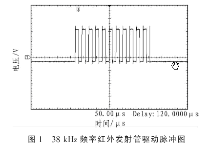 發射管選取SIR204-A型發射管,該紅外線二極管驅動電流范嗣為20~100 mA,其正向導通壓降為1.3~1.5 V,發出紅外線光波長范圍約為835~930 nm,發射角度為30°,直射時紅外線光強度最大。發射管驅動電壓采用脈沖電壓,38 kHz載波頻率,發送時長為280 μs,占空比為1/2的方波,發送間隔為720 μs。載波脈沖需要與紅外線接收管的型號相匹配。紅外發射管能夠匹配光電晶體管、光敏二極管和紅外接收器模塊,紅外傳感器的接收部分選擇了帶有放大和濾波功能的紅外線接收二極管。發射部分的設計需要考慮到接收部分的制約。經過驗證調制脈沖驅動電流能夠匹配紅外線接收管,將紅外線接收管導通。驅動發射管PWM的波形如圖1所示。