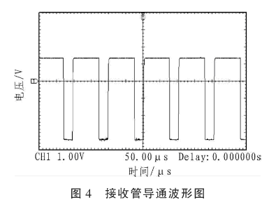 紅外線接收管選用HS0038型的紅外一體接收頭,該器件集成度高,能夠以小成本實現圖3所示功能。紅外線接收管需要接收38 kHz左右帶寬的脈沖波形,接收發射管只能接收間歇發射的紅外線,發射紅外線過于密集,接收管無法導通,需要予以注意。紅外線發射管發出38 kHz載波,將紅外線接收管導通。該波形頻率為1 kHz,周期內高電平時間720μs,低電平時間280μs。當有物體遮擋紅外線對射管時,發射源被遮擋,紅外線接收管無法導通,輸出高電平。由此可以判斷是否有物體從紅外線對射管中間通過。紅外線接收管導通時的輸出波形如圖4所示。