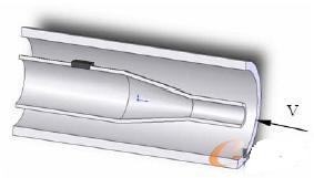 作者所在的研究組在前期應用壓力梯度法和壓力互相關法測量液壓系統流量進行了理論和實驗研究,取得了一定進展,在此基礎上,提出這種不需要引壓,直接讓 MEMS敏感芯體在管內獲得與流量對應的差壓信號的新方法。相比之下新方法在對系統較低擾動的前提下更易獲得較高的信號水平,精度能滿足一般液壓系統,具有高的動態測量頻寬。其機理是利用內置于管道中特殊設計的異徑結構裝置,如圖1所示,對內外流體分別產生收縮和擴壓雙效作用,獲得低壓損、低能耗的微小壓力差,通過置于上面的MEMS敏感芯體測取,并根據建立的壓差-流量關系模型,及仿真手段和實驗測試得出該狀態下的流量值。