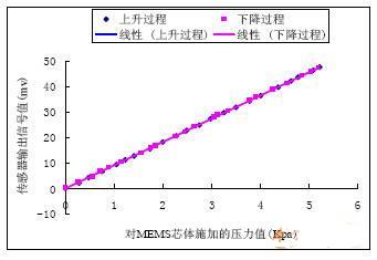 在進行實驗研究時,選取了一種壓阻式MEMS微型壓差敏感芯體,在組裝傳感器之前,采用了FLUKE 718 10G型壓力校準儀(Pressure Calibrator)對芯體進行標定。FLUKE 718 10G型壓力校準儀通過其自帶的一個主氣泵和一個微調氣泵可以輸出穩定的-12~30psi(-83~207KPa)氣壓,精度達到±0.05%滿量程。實驗所用的MEMS芯體額定工作壓力量程為6KPa(安全工作壓力十倍于滿量程),在10.00+/-0.01V激勵電壓下,用FLUKE壓力校準儀標定結果如下: