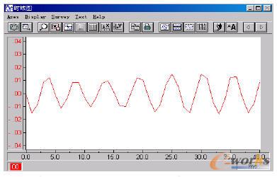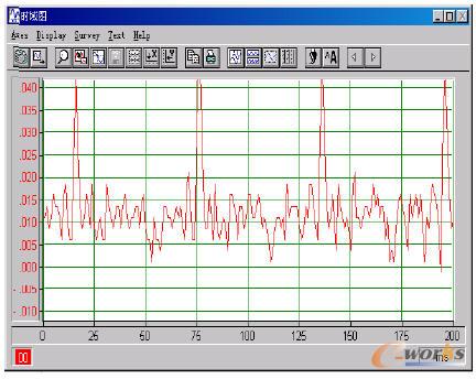 在動態試驗中,保持液壓泵提供20L/min的工作流量,使用Wavebook512信號系統對MEMS傳感器輸出流量信號進行采集,如圖7所示。盡管受到系統內閥口、管路等造成的干擾,而且由于柱塞泵各柱塞在制造、安裝以及使用中產生的誤差和磨損造成的不均勻現象,導致流量波動曲線有些變形,但是還是可以很清晰的看出流量的波動周期約為60ms,即頻率16.7Hz。由于電動機工作在50Hz頻率,額定轉速1000r/min,因此相應的軸向柱塞泵運轉頻率也是1000/60=16.7Hz,這正與上面的測量結果吻合。