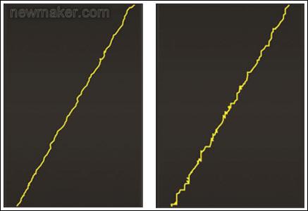 圖3. 一個(gè)機(jī)器臂握著4mm金屬片畫(huà)的直線。左側(cè)使用的是高SNR的觸摸屏控制器;右側(cè)使用的是低SNR觸摸屏控制器