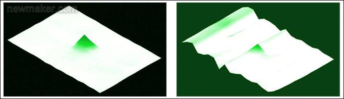 圖4. 4英寸屏上使用2mm導(dǎo)電書(shū)寫(xiě)筆的電容值剖面圖,左側(cè)剖面使用高SNR觸摸屏控制器;右側(cè)使用低SNR觸摸屏控制器。書(shū)寫(xiě)筆位于綠色錐體頂部;白色平面的 高度代表了背景噪聲。信噪比的增加有效降低了背景噪聲幅度,如左圖所示。如果右圖中的書(shū)寫(xiě)筆移到屏幕的左邊,信號(hào)將被噪聲淹沒(méi),書(shū)寫(xiě)筆將無(wú)法工作。
