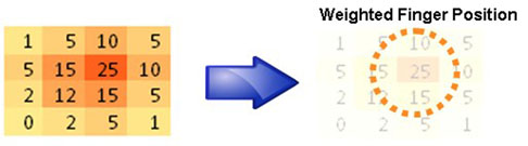 當(dāng)感測(cè)到的電容減去基準(zhǔn)值時(shí),就得到一個(gè)訊號(hào)值陣列,代表圖3所示的手指觸碰狀況。有許多種方法可根據(jù)這項(xiàng)資訊來(lái)判斷手指的位置,其中最簡(jiǎn)單的方法是計(jì)算質(zhì)心--質(zhì)量中心(Centriod),計(jì)算出一維或二維軸向感測(cè)數(shù)值的加權(quán)平均值。運(yùn)用一維質(zhì)心計(jì)算法,根據(jù)上述例子的X軸數(shù)據(jù),可算出(5×1+15×2+25×3+10×4)/(5+15+25+10)=150/55= 2.73。接著以液晶螢?zāi)坏慕馕龆葹闃?biāo)準(zhǔn),將這個(gè)位置值適當(dāng)?shù)乜s放,以便和螢?zāi)恢丿B。若ITO感測(cè)器的圖案超出液晶螢?zāi)坏倪吘墸瑒t必須進(jìn)行一些轉(zhuǎn)換計(jì)算。