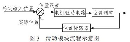 如圖3滑動(dòng)模塊流程示意圖所示,本系統(tǒng)方案設(shè)計(jì)在傳輸系統(tǒng)和SMT生產(chǎn)設(shè)備的連接處,增設(shè)一個(gè)滑動(dòng)裝置,主要由滑動(dòng)板、滾珠和位置傳感器組成,形成了一個(gè)閉環(huán)控制,起到平衡作用。在生產(chǎn)過(guò)程中,由模塊裝置上的位置傳感器實(shí)時(shí)將實(shí)際位置信號(hào)反饋給系統(tǒng),與給定輸入位置信號(hào)相比較產(chǎn)生一個(gè)位置誤差信號(hào),然后由這個(gè)誤差信號(hào)驅(qū)動(dòng)電機(jī)運(yùn)轉(zhuǎn)進(jìn)行位置調(diào)整。當(dāng)設(shè)備平衡時(shí),位置誤差為零,不進(jìn)行位置調(diào)整;當(dāng)傳輸機(jī)有偏斜時(shí),位置誤差不為零,由它驅(qū)動(dòng)電機(jī)運(yùn)轉(zhuǎn),使設(shè)備進(jìn)行一定的位置調(diào)整。通過(guò)這套裝置,消除由振動(dòng)產(chǎn)生位置偏移、利于整個(gè)生產(chǎn)線的生產(chǎn)、增強(qiáng)各設(shè)備之間銜接。
