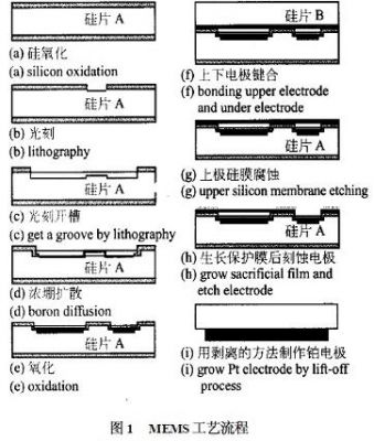 硅電容式壓力傳感器的敏感元件是半導(dǎo)體薄膜,它可以由單晶硅、多晶硅等利用半導(dǎo)體工藝制作而成。典型的電容式傳感器由上下電極、絕緣體和襯底構(gòu)成。當(dāng)薄膜受壓力作用時(shí),薄膜會(huì)發(fā)生一定的變形,因此,上下電極之間的距離發(fā)生一定的變化,從而使電容發(fā)生變化。但電容式壓力傳感器的電容與上下電極之間的距離的關(guān)系是非線性關(guān)系,因此,要用具有補(bǔ)償功能的測(cè)量電路對(duì)輸出電容進(jìn)行非線性補(bǔ)償。由于高溫壓力傳感器工作在高溫環(huán)境下,補(bǔ)償電路會(huì)受到環(huán)境溫度的影響,從而產(chǎn)生較大的誤差。基于模型識(shí)別的高溫壓力傳感器,正是為了避免補(bǔ)償電路在高溫環(huán)境下工作產(chǎn)生較大誤差而設(shè)計(jì)的,其設(shè)計(jì)方案是把傳感器件與放大電路分離,通過模型識(shí)別來得到所測(cè)環(huán)境的壓力。高溫工作區(qū)溫度可達(dá)350℃。傳感器件由鉑電阻和電容式壓力傳感器構(gòu)成。其MEMS工藝如下: