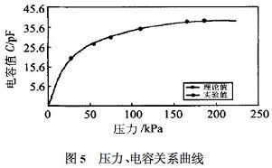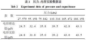 1可見,擬合的電容誤差小于1%。由此可見,在不同的時(shí)刻測(cè)得UO(t),通過曲線擬合得出參數(shù)RC。再給電路加小信號(hào)直流電源,測(cè)出R值,即求得C,通過C值則可知被測(cè)環(huán)境的壓力。圖5為350℃時(shí),不同的壓力所對(duì)應(yīng)的電容的理論值和實(shí)驗(yàn)值,從實(shí)驗(yàn)數(shù)據(jù)(表2)可得,在測(cè)壓的過程中,利用模型識(shí)別的方法,誤差較小,其測(cè)壓誤差小于2%。