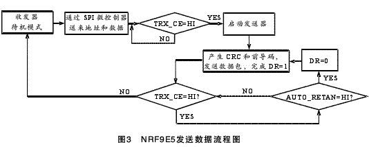 在現代無線通信中,數據都是以數據包的方式來進行傳輸的.對NRF9E5這樣的無線片上系統,每次發送和接收數據也是以數據包的方式進行的.數據包格式是通信協議的重要部分,NRF9E5的無線數據包格式有:Preamble、ADDR、PAYLOAD、CRC.其中,Preamble是前導碼,由硬件自動加上去;ADDR則發送32~40位地址碼;PAYLOAD是有效數據(最大為32bit);CRC是循環冗余碼校驗和,可以由內置CRC糾檢錯硬件電路自動加上,可設為0位、8位或16位.傳感器節點最重要的工作就是將采集到的數據發送出去.要實現數據的無線發送,必須使處理器中的無線收發器工作在發送模式下.NRF9E5的收發器(NRF905)共有3種工作模式:ShockBurst接收(RX)方式、Shock Burst發送(TX)方式和節能方式,其發送數據流程如圖3所示.