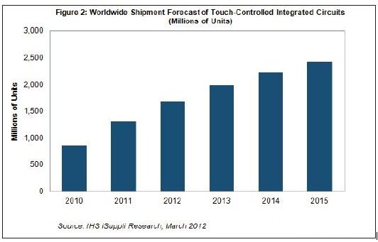 在蘋果公司iPhone和iPad暢銷的推動(dòng)下,智能手機(jī)和媒體平板中的觸控屏急劇增長(zhǎng),從而導(dǎo)致觸摸控制器集成電路(IC)出貨量在短短五年內(nèi)將增長(zhǎng)近兩倍。
