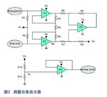 這個(gè)測(cè)量?jī)x表放大器包含有兩個(gè)級(jí)。最后一個(gè)級(jí)(亦即輸出級(jí))是一個(gè)差分放大器,它能夠拒絕直流電平以及同時(shí)影響兩個(gè)輸入的干擾和噪聲電壓源。由兩個(gè)放大器組成的第一級(jí)(亦即是輸入級(jí))則被配置成一個(gè)可將輸入隔離的緩沖器。可是,基于放大器間的失配使它們彼此不能相互連接,所以要在兩個(gè)放大器之間加裝平衡電阻。將兩個(gè)級(jí)的增益相乘便可得出測(cè)量?jī)x表放大器的增益。理論上,共模抑制比(CMPR)應(yīng)該是無(wú)限大,但由于出現(xiàn)電阻失配,導(dǎo)致輸出級(jí)的非零共模增益非常小。在電路的輸入級(jí)中,流經(jīng)所有電阻的電流是一樣的。這都有賴于LMP2234具有高輸入阻抗和低輸入偏置電流的特點(diǎn)。