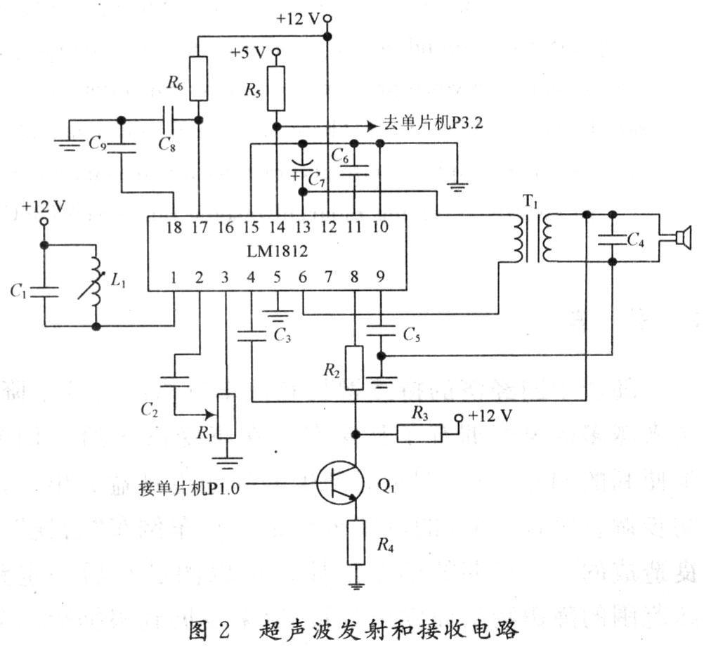 超聲波發(fā)射和接收電路如圖2所示。當(dāng)LM1812的8腳為高電平時(shí),LM1812處于發(fā)射模式;當(dāng)8腳為低電平時(shí),LM1812處于接收模式。值得注意的是,單片機(jī)到LM1812的連接要進(jìn)行5~12 V的電平轉(zhuǎn)換。當(dāng)LM1812處于發(fā)射模式時(shí),L1,C1振蕩槽路被切換為振蕩模式,振蕩信號經(jīng)驅(qū)動放大后,由13腳及6腳輸出。6,13腳之間所接變壓器線圈的匝數(shù)比是根據(jù)TCF40-25TR1型收發(fā)一體式超聲波傳感器的阻抗來確定的。實(shí)驗(yàn)證明,變壓器線圈的匝數(shù)比大約為4:1時(shí)可實(shí)現(xiàn)與超聲波發(fā)送器阻抗相匹配。超聲波接收器接收到的超聲波信號經(jīng)電容耦合由4腳輸入,再經(jīng)內(nèi)部兩級放大后同由1腳的諧振回路取出的信號一起送到檢測器。當(dāng)檢測到超聲波回波信號時(shí),LM1812的14腳(與單片機(jī)的INT0端相連)變?yōu)榈碗娖剑箚纹瑱C(jī)的T0計(jì)數(shù)器停止計(jì)數(shù)。
