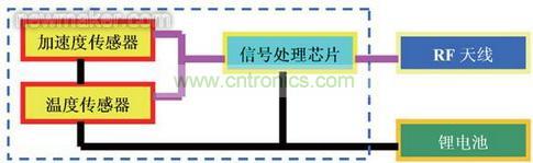 新一代DTPMS將MEMS的加速度傳感器和溫度傳感器與信號處理電路集成在一塊芯片中。傳感器模塊的構成部件有集成MEMS傳感器和信號處理電路的胎壓監測器芯片、電池以及向本車駕駛臺傳輸計測結果的天線這三個部分,如圖1所示。由此使得內置傳感器模塊的重量大大降低,先前安裝在輪胎氣門嘴上的已有傳感器模塊重量原為1個37g,而新一代DTPMS粘貼在輪胎上的模塊重量僅為11g。其電池壽命可達到與輪胎一樣的6年。