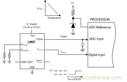 處理器的模數轉換器用于采集溫度模擬電壓(VTEMP)。當溫度超出臨界值時,過熱(TOVER)輸出端會驅動處理器的輸入端進行指示。跳脫點由兩個無源電阻器(RSENSE1和RSENSE2)設置,而不是由有效參考端和偏壓電阻器設置。