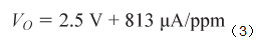 使用65 nA/ppm的典型傳感器響應(yīng),可以通過下式將輸出電壓轉(zhuǎn)換為一氧化碳的ppm: