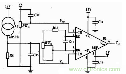 AD590是集成溫度傳感器,輸出為電流,相當于恒流源,若要對此進行放大需先轉換為電壓,可在其回路串入電阻,根據歐姆定律,電阻上電壓的大小可反映電流的大小,也就是溫度的高低。圖2是溫度傳感器AD590的信號調理變換電路