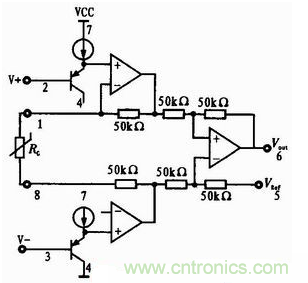 圖2中R11是采樣電阻,阻值10 kΩ,精度1‰;0 ℃時傳感器輸出電流273.15μA,電阻上的電壓2.731 5 V;100 ℃時傳感器輸出電流373.15 μA,電阻上的電壓3.731 5 V;由于溫度為0℃時傳感器器輸出不是0,因此放大前應先減去該零點電壓,該電壓常量見圖中VRef,由9V利用電位器RW11分壓后獲得,大小為2.731 5 V;0℃時運放輸入差分電壓(Vin-VRef)為0 V。圖中U1為儀表放大器,選用AD623,單電源供電,增益1~1 000,其結構圖如圖3所示,只需調節一個電阻RG即可改變增益,Vo=(1+100kΩ/RG)(V+~V-),輸出信號基準電平可以在一定范圍內任意給定(利用5腳REF端)。