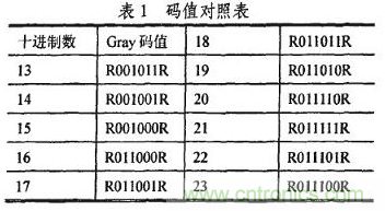 編碼采用格雷碼(Gray)為數(shù)值碼,以某一固定碼寬為參考碼R,它用于標(biāo)尺定位和提高精度。Gray碼是一種絕對編碼方式的無權(quán)碼,它所具有的循環(huán)、單步特性能消除隨機(jī)取數(shù)時出現(xiàn)重大誤差的可能,其任意兩個柏鄰整數(shù)之間轉(zhuǎn)換時,只有一個位數(shù)發(fā)生變化,大大減少了由一個狀態(tài)轉(zhuǎn)到下一個狀態(tài)時的邏輯混淆,具有較強(qiáng)的容錯能力。以6位編碼為例,其部分十進(jìn)制數(shù)與Gray碼的一一對應(yīng)關(guān)系如表1所示。
