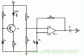 為了使發(fā)光二極管的亮度始終保持一定,由 LED1 、N1 、R0 、ZD1 和R1構(gòu)成恒流源紅外發(fā)射電路,IC 2B,PH,R2~R4構(gòu)成紅外接收電路,信號(hào)通過(guò)C1耦合輸出。當(dāng)PH接受到的紅外光能不變時(shí),IC 2B的7腳輸出電平不變,則C1無(wú)耦合信號(hào)輸出。當(dāng)由于絲線的擺動(dòng)而不斷重復(fù)地切割紅外光束使PH所接收到的光能改變時(shí),C1耦合輸出相同頻率的脈動(dòng)信號(hào)。見(jiàn)圖1。