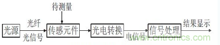 隨著工藝水平的提高,光纖技術目前相對成熟。光纖傳感器即為應用光纖傳輸?shù)幕驹斫M合的一個廣電感應系統(tǒng)。通常的光纖傳感系統(tǒng)由光源、光導纖維、光傳感元件,光調(diào)制元件和信號處理部分組成。其工作原理如下圖所示:光源發(fā)出的光經(jīng)過光導纖維進入光傳感元件,而在光傳感元件中受到周圍環(huán)境場的影響而發(fā)生變化的光再進入光調(diào)制機構,由其將傳感元件測量的參數(shù)調(diào)制成幅度、相位、偏振等信息,這一過程稱為光電轉(zhuǎn)換過程,最后利用微處理器進行信號分析。