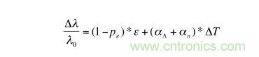 右邊加號前的第一個表示式表示的是應變的變化對反射波長的影響。其中pe是應變光學靈敏系數,而ε是光柵所受到應變影響。加號后面的第二個表達式表示的是溫度的變化對波長造成的影響。其中αΛ是熱膨脹系數而αn是溫度光學靈敏系數。αn體現了光折射率因為溫度變化造成的影響而αΛ體現了同樣的溫度變化造成的光柵周期的改變。