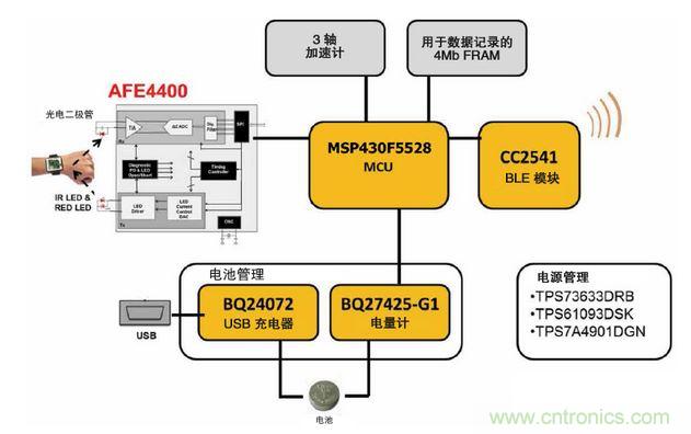 圖4中就是這樣一個TIDesign (TIDA-00011),其中展示了一個典型的光學(xué)、佩帶在手腕上的心率系統(tǒng)應(yīng)用。這個手腕佩帶式心率監(jiān)視器參考設(shè)計說明了TI技術(shù)是如何組合在一起來提供完整解決方案的。使用一個LED到光電二極管光信號的轉(zhuǎn)換,TI的AFE4400($3.3188)感測由佩帶者脈搏跳動所引起的皮膚表面變化,然后將模擬信號放大并轉(zhuǎn)換為數(shù)字信號,然后再將此數(shù)字信號傳遞給MSP430($2.0250) MCU。基于TI SimpleLinkTM Bluetooth低能耗CC2541($2.3625)無線MCU的模塊提供到智能手機或其他本地系統(tǒng)的無線連接。非易失性鐵電隨機存儲器提供數(shù)據(jù)記錄功能,而加速計感測身體運動。此參考設(shè)計還包括管理電池電量和不同系統(tǒng)功能的器件。希望設(shè)計此類終端設(shè)備的開發(fā)人員可以從TI直接訪問所有內(nèi)容,原樣搭建這一系統(tǒng),并且立即運行。在這里,要定制解決方案,開發(fā)人員只需添加其自己的知識產(chǎn)權(quán)即可。