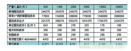 4”圓晶片生產線生產MEMS壓力傳感器Die成本估計如表所示,新增固定成本是指為該項目投入的人員成本和新設備的折舊(人員:專家1名+MEMS設計師2名+工程師4名+工藝師5名+技工12名,年成本147萬元,新增設備投入650萬元,按90%四年折舊計算);現有4”線成本是指在5次光刻條件下使用4”線的成本(包括人工、化劑、水電、備件等的均攤成本);硅片材料成本是指雙拋4寸硅片的價格。