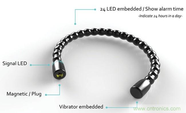 而手鏈采用磁性連接頭作為連接環,連接頭上有指示燈,通過不同的顏色來指示電池的電量,連接頭也有USB接口,可以通過適配器來為智能手鏈充電。同時這款智能手鏈內置了藍牙模塊,可以通過藍牙連接智能手機,用戶可以通過手機程序來設置鬧鐘時間,讓智能手鏈用溫柔的震動喚醒自己。