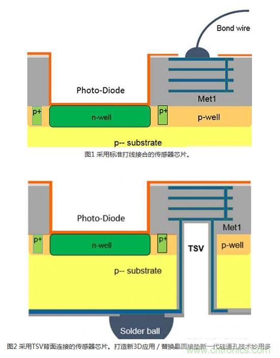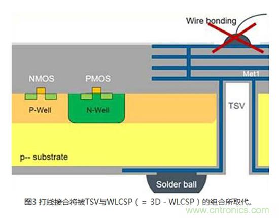 模擬3DIC技術(shù)通常是透過(guò)建造芯片正面到IC背面的電氣連接來(lái)實(shí)現(xiàn)傳感器應(yīng)用。 在許多傳感器應(yīng)用,例如光學(xué)、化學(xué)、氣體或壓力傳感器中,感測(cè)區(qū)域是位在CMOS側(cè)(晶圓的頂端)。 芯片和導(dǎo)線(xiàn)架之間最常用的連接是打線(xiàn)接合(Wire bonding)(圖1)。 無(wú)論是使用塑料封裝,或是將裸片直接接合在印刷電路(PCB)或軟性電路板上,對(duì)于某些會(huì)將感測(cè)區(qū)域暴露出來(lái)的應(yīng)用而言,打線(xiàn)接合并非理想的解決方案。 采用專(zhuān)業(yè)晶圓代工業(yè)者的專(zhuān)有TSV技術(shù),可以利用TSV、背面RDL和芯片級(jí)封裝(WLCSP)(圖2)來(lái)替代打線(xiàn)。